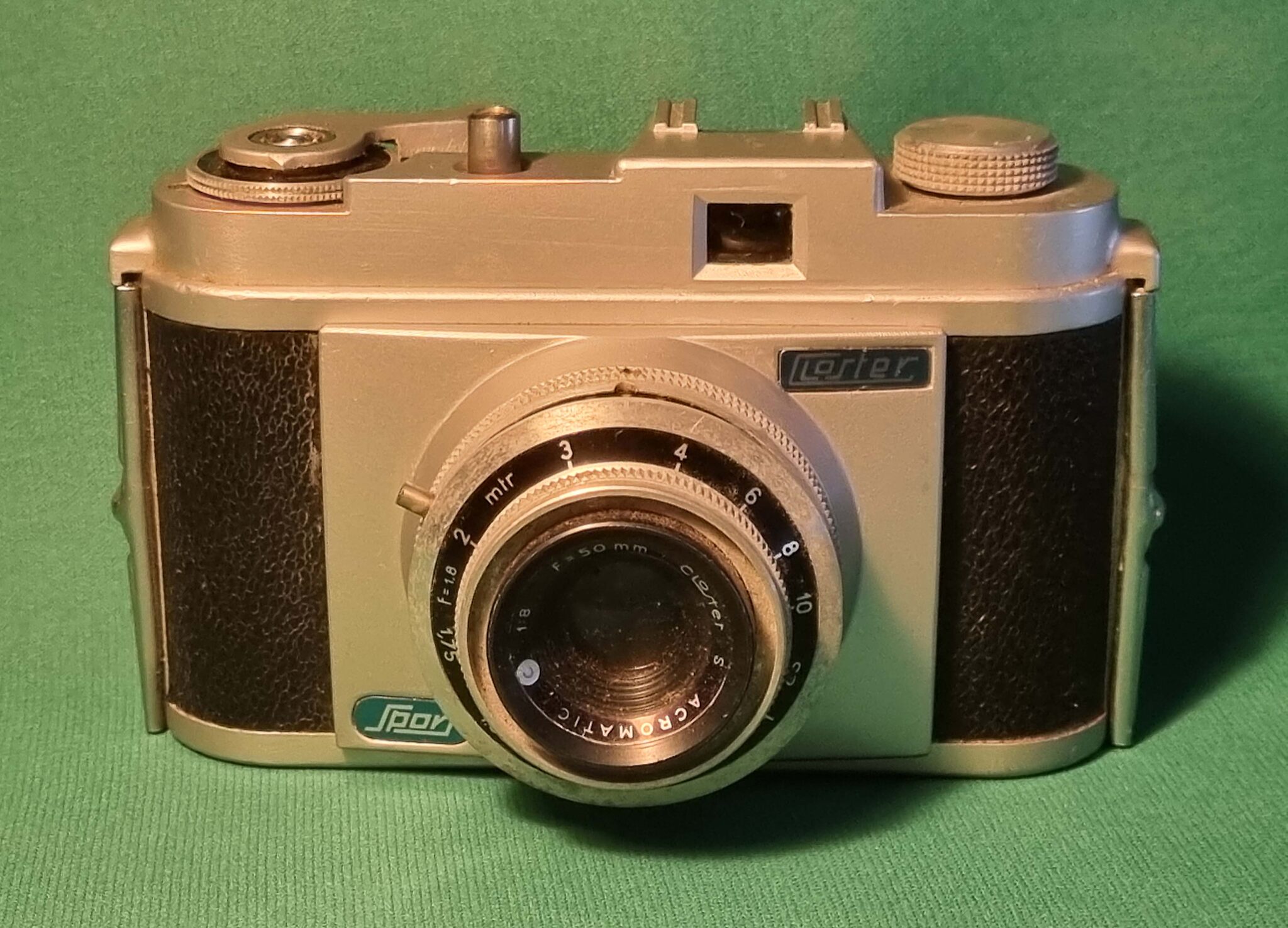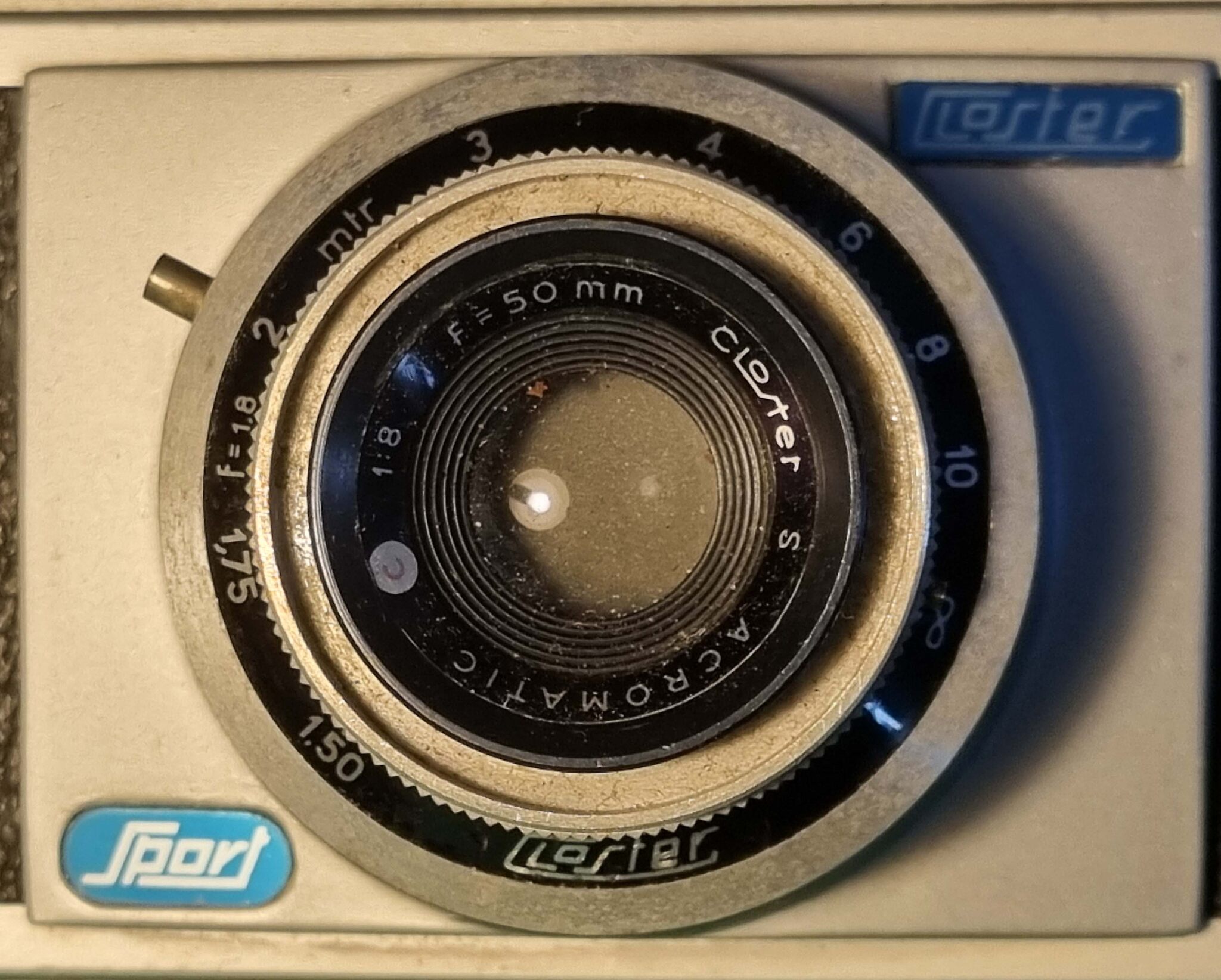 | Closter: Sport | c1956 | Pellicola 135 formato negativo 24x36 mm Obiettivo Acromatic Closter 50mm f/8 Otturatore centrale a due lamelle prodotto dalla stessa Closter, con tempi di scatto di 1/25, 1/50, 1/100, 1/200, 1/300, B. Valore diaframmi indicato da ideogrammi pioggia, sole coperto, sole pieno Peso 456 g Anno: Circa 1960 - 61 | ||||