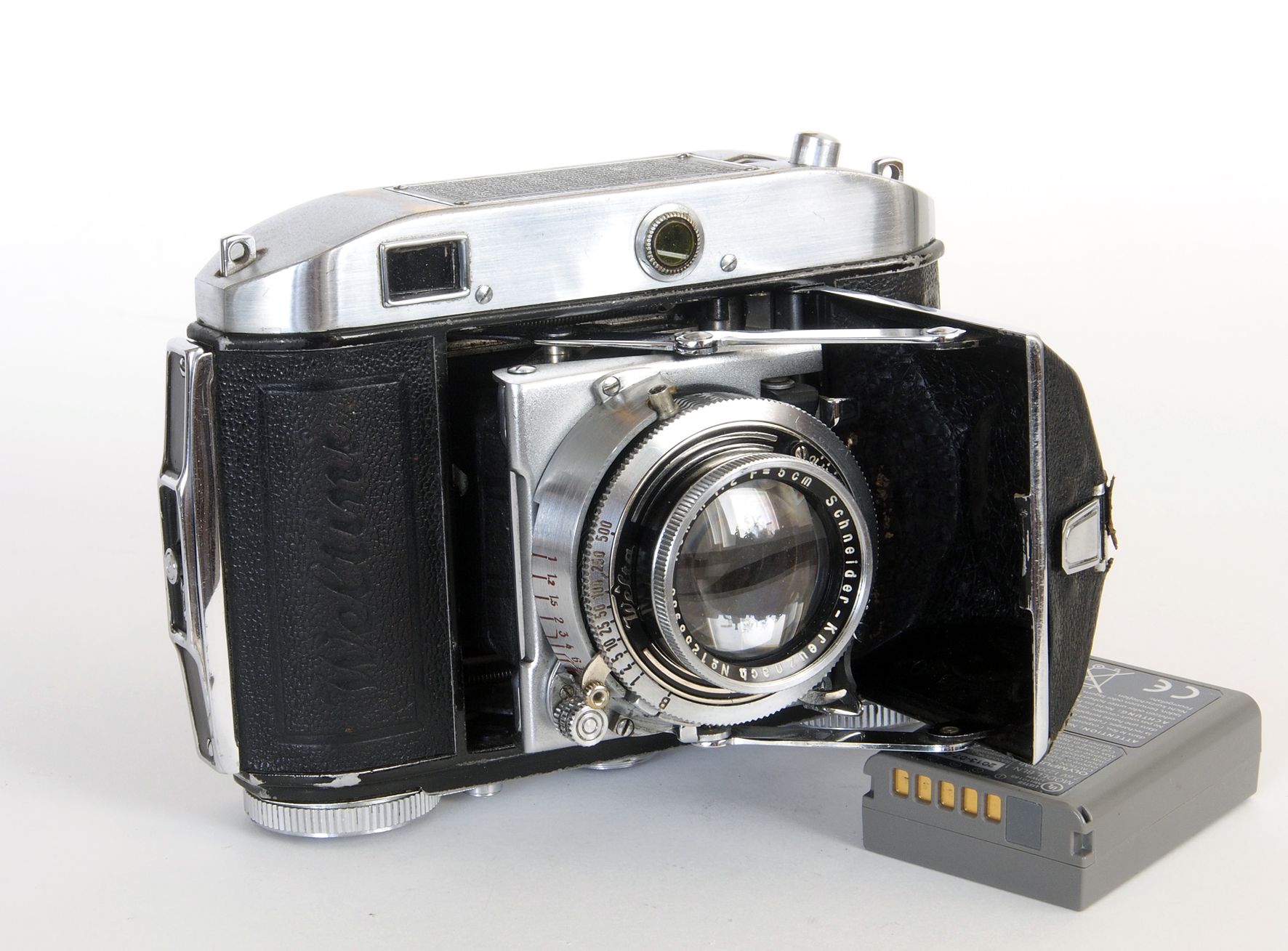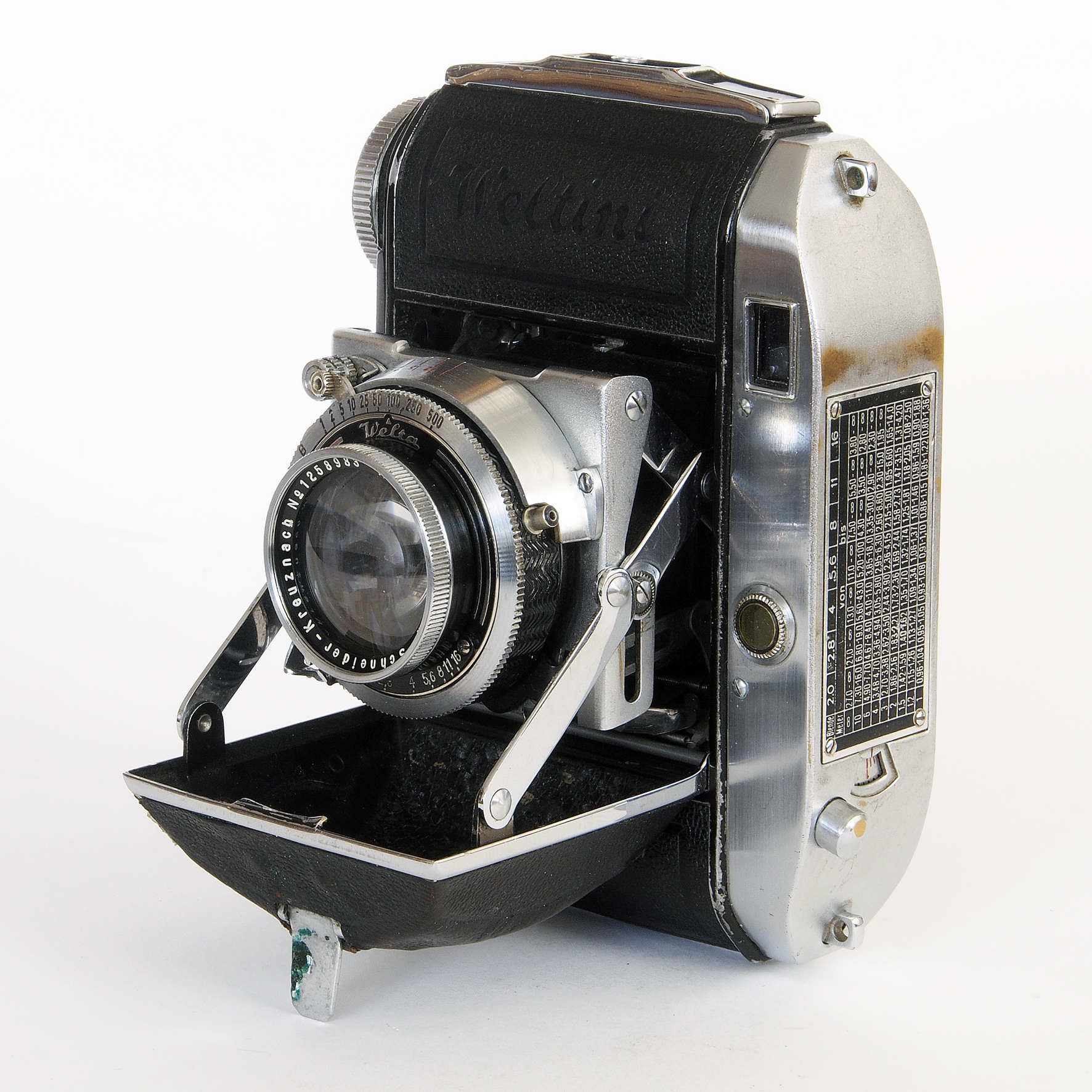 | Zeiss Ikon: Nettax 513/16 (6x6) | 1955-1957 | O 126011 | 2011 | Metered version of Nettar. With double exposure locking system and winding indicator in the view finder. Novar 1:4.5 f=75 mm #274 | ||