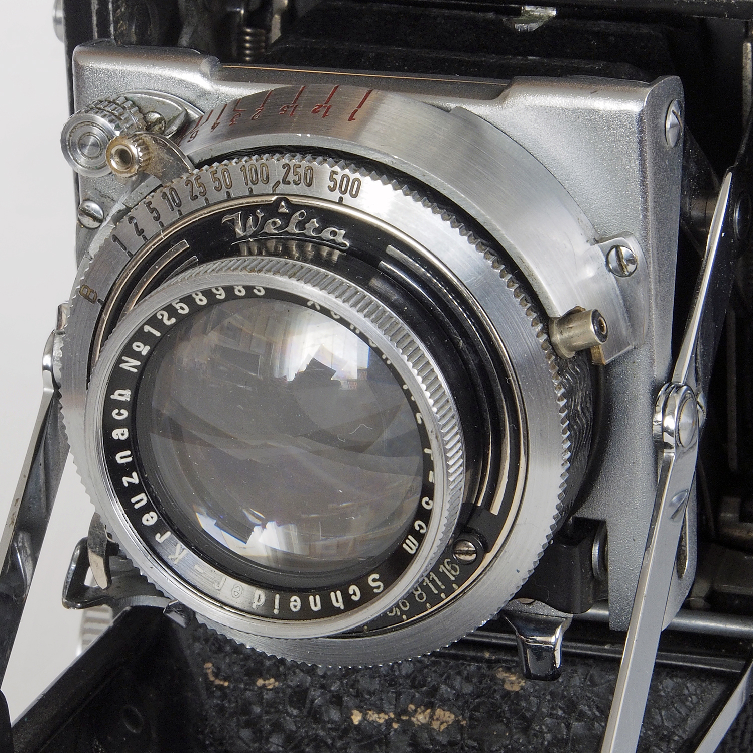 | Beier: Gloria | c1929 | 89146 (lens No) | June 01, 2022 | Folding camera for 6x9 exposures on 120 film. Black leatherette covered metal body. Betar Anastigmat 1:6.3 F=10,5 cm on Stein & Binneweg shutter (25, 50, 100, B+T). With waist level brilliant reflex and folding frame finders. Gloria embossed in camera front below the handle. Manufacturer indicated on the lens rim. Not much info on www. #964 | ||